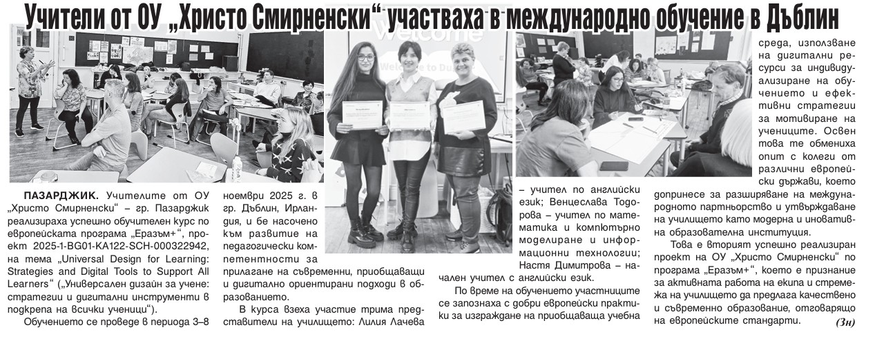 Знаме-Дъблин Публикувано от A A Дата 16 / декември Share: A A Може да харесате Коледен дух и приятелство между 4. „б“ и 7. „б“ клас 5 януари, 2026 Празничен спектакъл 4 януари, 2026 По Коледа стават чудеса 4 януари, 2026