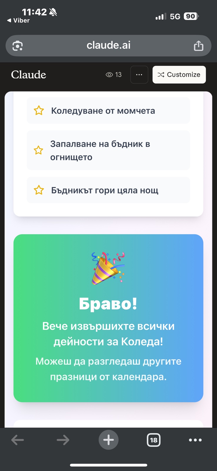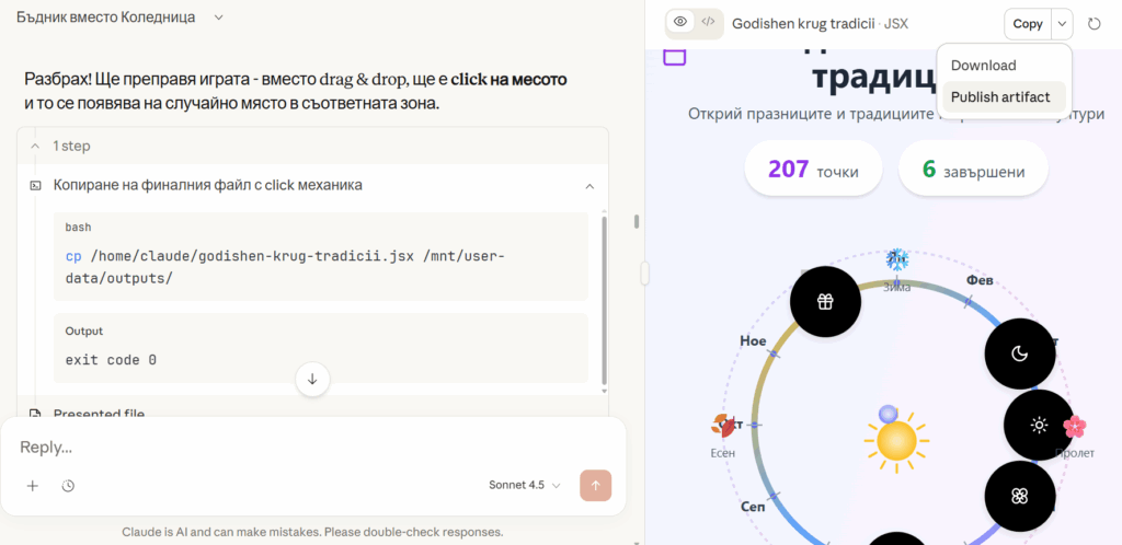Учителят изпраща линк до учениците, който отваря нарочно създадено интерактивно приложение (отворете го тук: https://claude.ai/public/artifacts/ab2e665a-d91c-4abf-9ffd-312f7b156f60). На екрана се визуализират всички изучени празници, подредени в кръг – както са ги възприемали хората от традиционното общество. При избор на конкретен празник ученикът вижда: